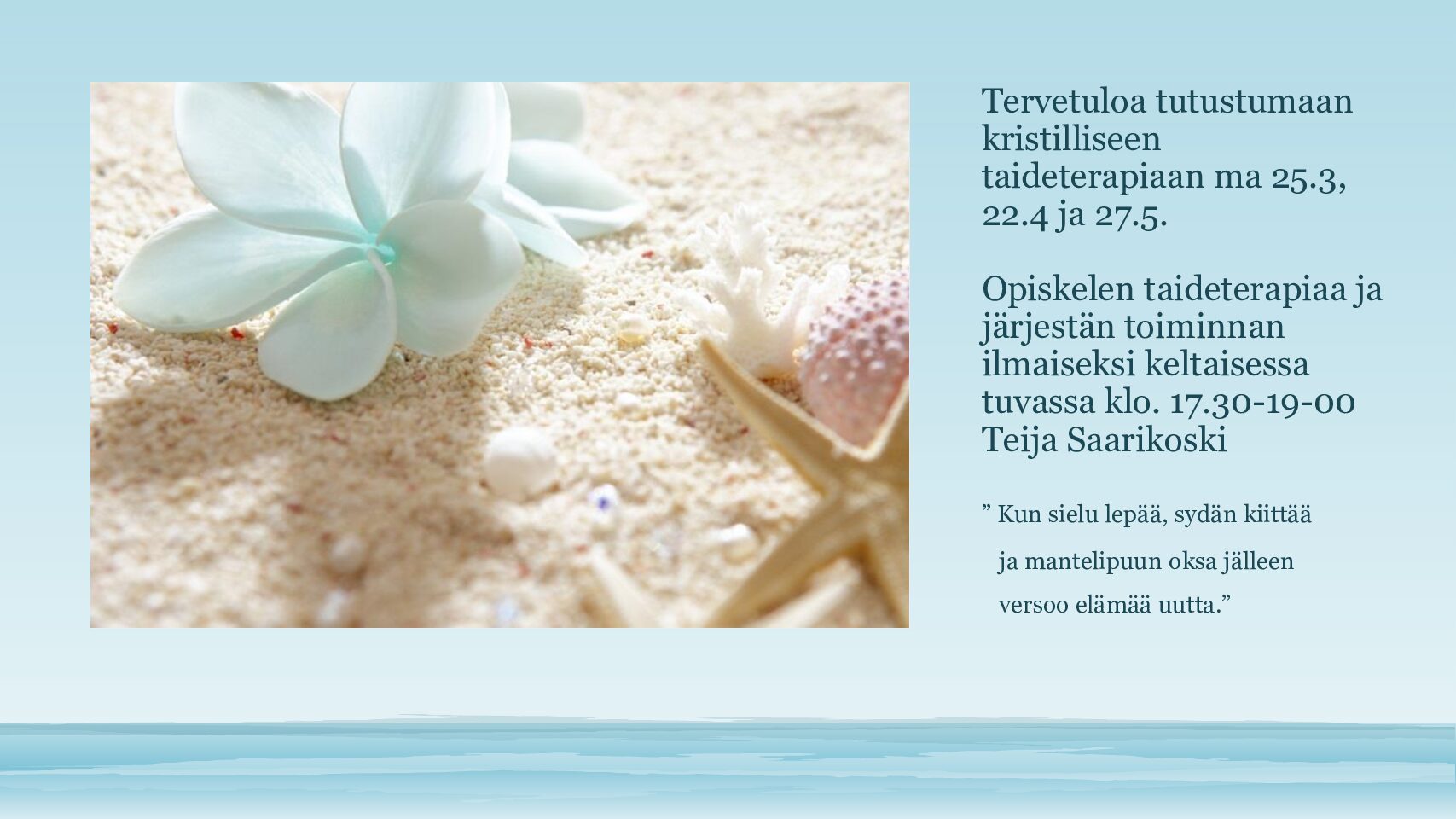 Kristikka järjestää Keltaisessa Tuvassa kevään 2024 aikana kolmen tapaamiskerran kestävän taideterapia ryhmän. Taideterapia on luovuutta hyödyntävä menetelmä ehyempään minuuteen. Taideterapia ryhmä on pieni, jotta kaikilla osallistujilla on tilaa olla aidosti läsnä ja saada se hyöty, joka ryhmään osallistumisesta ja luovien tekniikoiden hyödyntämisestä voi parhaimmillaan saada. Ryhmään otetaan mukaan vain 8 osallistujaa, luottamuksellisuuden säilyttämiseksi. Terapiaa ohjaa taideterapiaopiskelija Teija Saarikoski.